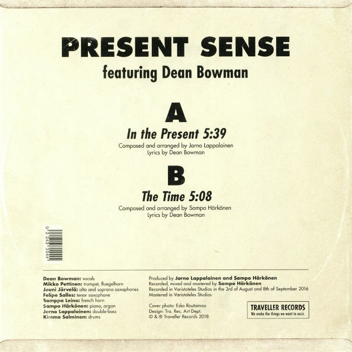 It's been a long time between drinks for Present Sense, a Finnish combo helmed by experienced jazz bassist Jarno Lappalainen. Research confirms that the previous Pressent Sense single landed way back in 2004. For this return to the studio, American jazz vocalist Dean Bowman has joined in the fun. His Gregory Porter style vocals seemingly soar above the band's lilting, emotion-rich jazz on A-side "In The Present", with each musician getting solo space in the track's magical final moments. Turn to the B-side for "The Time", a more up-tempo jazz workout full of alternating horn solos and superb double bass playing by Lappalainen.