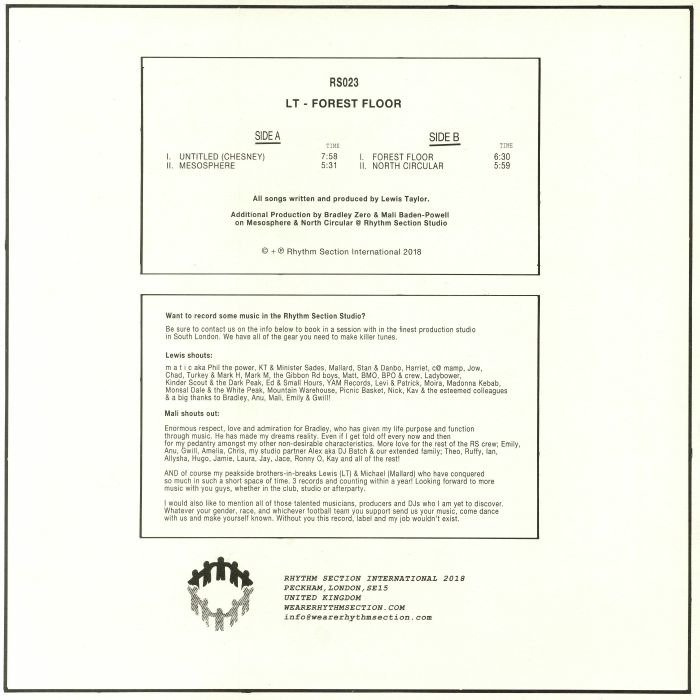 After a debut outing on International Black last year with his best friend Mallard, LT graduates onto Rhythm Section INTL with a stunning debut solo effort: FOREST FLOOR.Aged just 20 years old, Lewis Taylor aka LT is another prodigal talent from the north of England, whose association with Rhythm Section goes back to his school days. A fan of the label from an early age, Lewis regularly made pilgrimages to the pool hall as soon as he was old enough to do so. It was these visits with his old school friend Mallard (who had recently moved down to London from Derbyshire to study music) which proved to be a formative influence, prompting him to try his hand at production...It turned out he was quite the natural, with his second ever effort as an 18 year old making it onto this very EP. Sitting somewhere between electro, house and techno with a healthy dose of breaks - LT constructs complex arrangements with as much of a nod to the retro summer of love stylings of Lone as to the new age bounce of the Pender Street Steppers. The piano house stabs of 'Untitled (Chesney)' reverberate around chopped breaks and screaming samples, anchored down by bouncy organ bass and FM lead synth which really begs the question: 'How did LT develop such a rich lexicon of club culture references in such a short time' We'd be tempted to believe it was just pure luck, if this mastery of rave aesthetics wasn't repeated throughout the EP...