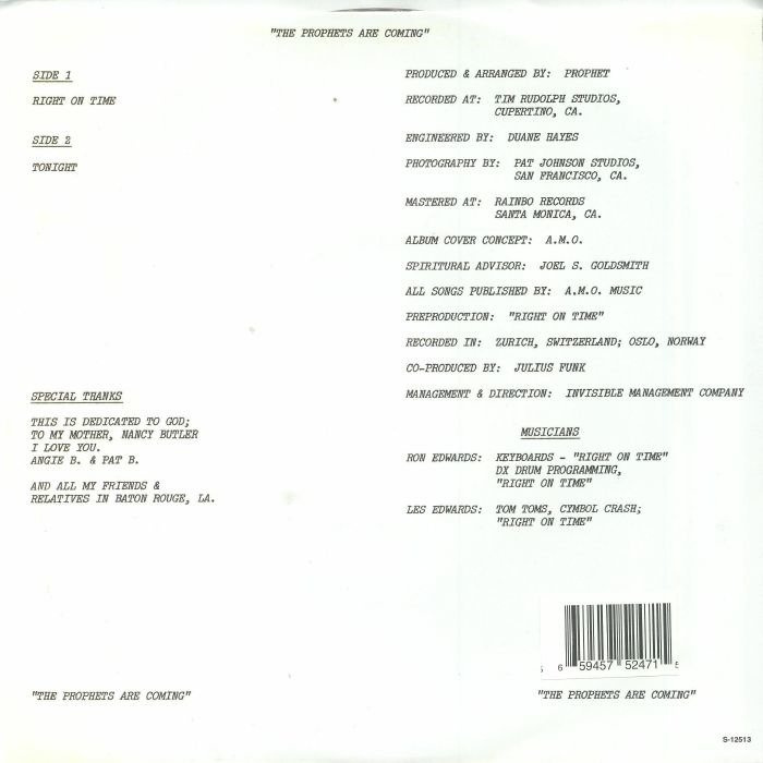 Reissue of two tracks from Prophet's 1984 Holy Grail album 'Right On Time'. Follows Prophet's recent comeback release on Stones Throw, 'Wanna Be Your Man'. For all fans of modern funk / boogie. Forthcoming tour dates in the UK and Europe with Peanut Butter Wolf to be announced.