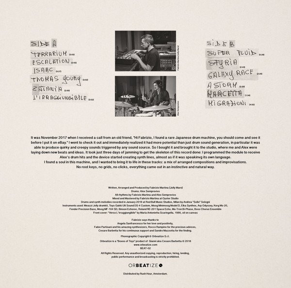 It was November 2017 when I received a call from an old friend, "Hi Fabrizio, I found a rare Japanese drum machine, you should come and see it before I put this on ebay." I went to check it out and immediately realized it had more potential than just drum sounds generation, it was able to produce quirky and creepy sounds if triggered by any sound source. So I bought it and brought in the studio, where me and Alex were laying down new beats and ideas. It took just three days of jams to get the skeleton of this record done: I programmed the module to receive Alex's drum hits and the device started creating synth lines, almost as it was speaking its own language.I've found a soul in this machine, and I wanted to bring it to life in these tracks, a mix of arranged compositions and improvised jams. No root keys, no grids, no clicks, everything came out in an instinctive and natural way