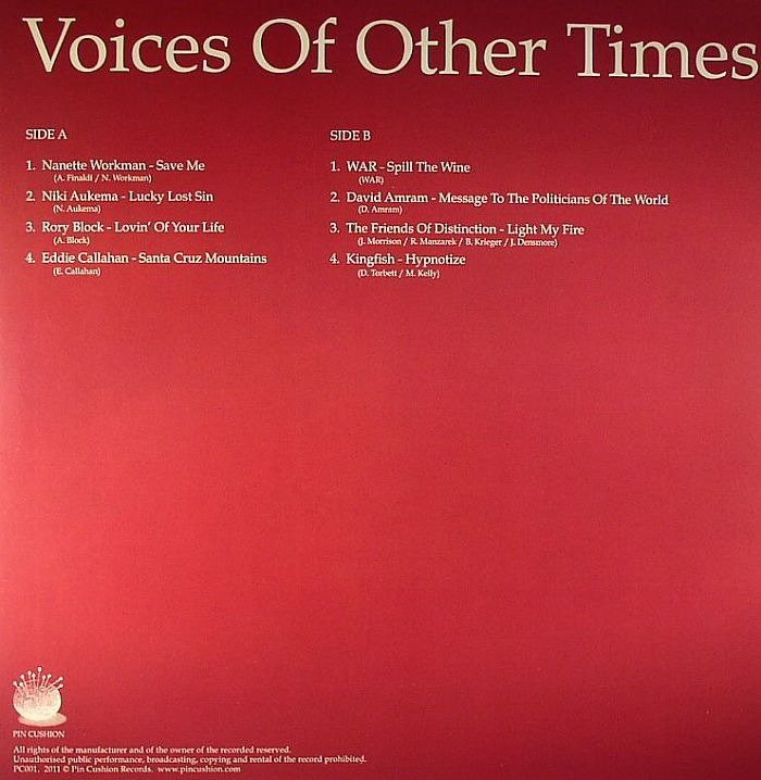 Fantastic new LP on Pin Cushion Records featuring eight superb tracks of the finest funky rock, folk and soul. The A side kicks off with the awesome funky monster 'Save Me', an absolute dancefloor bomb with slamming b-line from Nanette Workman's self titled 1976 LP. Next up is the super funky 'Lucky Lost Sin', a wicked female vocal funk-folk-jazz cut that also works well in the clubs, followed the great uplifting vibe of Rory Block's 'Lovin' Of Your Life'. Closing this side we have the wonderfully laid-back 'Santa Cruz Mountains' taken from Eddie Callahan's hugely in-demand and impossible to find 'False Ego' LP. The flip side features the excellent 'Spill The Wine', a great Rhodes-driven workout from Eric Burden's WAR, followed by David Amram's 'Message To The Politicians of the World', a killer spoken word track over a sweet melody. Next up is Friends Of Distinction's 'Light My Fire', an amazing funky cover of the Doors' classic taken from their rare 1969 Highly Distinct LP and last but not least a cool breezy summer groover from Bay Area band Kingfish whose lineup included the legendary Bob Weir, founder member of The Grateful Dead. A superb selection of tracks, not to be missed.
