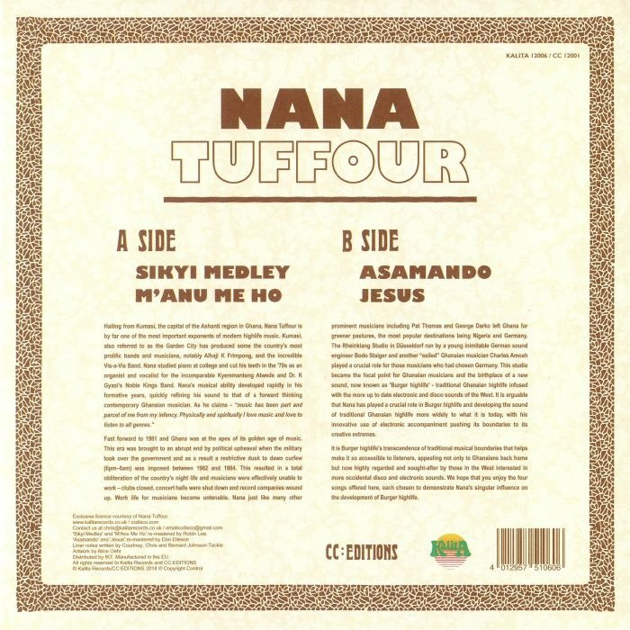 Kalita Records and CC:EDITIONS (a new venture by Australia’s CC:DISCO) jointly announce a 12″ EP comprised of four of Nana Tuffour’s greatest electronic burger highlife tracks, accompanied by interview-based liner notes. Here, in partnership with Nana, we select two highly sought-after songs from his 1993 release ‘Genesis’, namely ‘Sikyi Medley’ and ‘M’Anu Me Ho’, and pair them his with two lesser known yet equally deserving tracks ‘Asamando’ and ‘Jesus’ from his 1997 CD-only release ‘Highlife Tropicana’.
