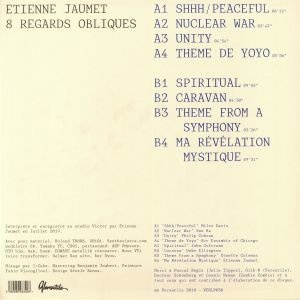 Over the last decade, Zombie Zombie man Etienne Jaumet has been one of Versatile Records' most consistent artists, delivering a string of albums in an inimitable style that sits somewhere between synthesizer-heavy 1970s horror soundtracks, experimental electro-jazz, paranoid ambient, punchy Afro-funk-fusion and quirky, kosmiche-era synth-pop. He's at it again on "8 Regards Obliques", variously opining on the threat of nuclear war over a chugging beat ("Nuclear War"), layering jaunty Afro horns over deep space electronics ("Unity"), showcasing his deep and electronic take on jazz-house ("Theme De Yo Yo"), laying down mind-altering jazz ragas ("Spiritual"), and escorting us to some far-off galaxy (the astonishingly good "Ma Revelation Mystique").