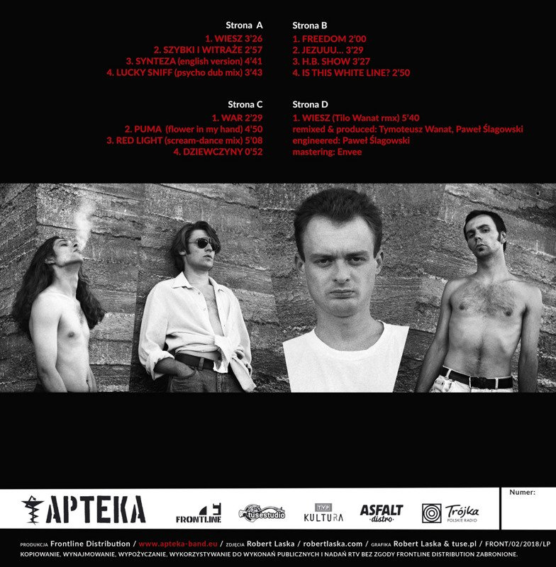 Tuż po nagraniu płyty wydarzyła się tragedia dla społeczności Apteki - w wypadku samochodowym zginęli Maciej Wanat - perkusista, niezwykła osobowość, filar grupy i Michał Orlewicz, muzyk i przyjaciel wspierający Aptekę. Ta tragedia odcisnęła niewidzialne piętno i dlatego trzymany przez Was album dedykowany jest pamięci Maćka Wanata. Maciej pozostawił po sobie dziedzictwo - tworzoną muzykę i syna TILO Wanata, który z Pawłem Ślagowskim stworzył remiks utworu „Wiesz” na stronie D albumu. Finalny mastering remiksu zrobił Envee. Z największym honorem witamy TILO w aptekarskiej rodzinie!