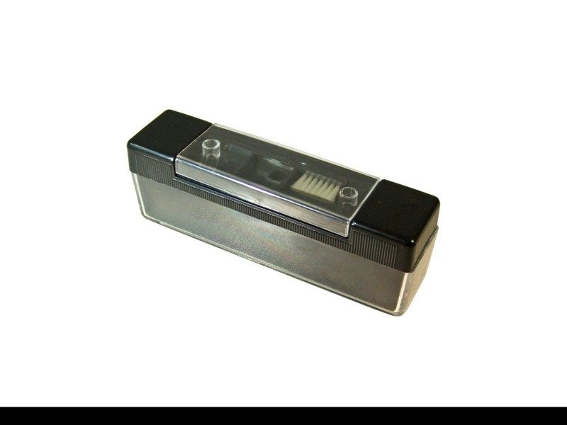 Record cleaning brush with soft velvet padding and a sapphire brush in the lid. The record cleaning brush gently cleans your vinyl records.