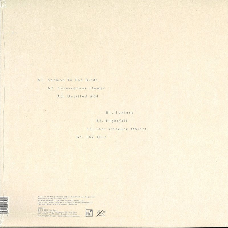 Kingdoms welcomes Finnish composer, producer, visual artist and filmmaker Hannu Karjalainen. His recording career now spans over a decade, beginning under the pseudonym Hannu and later under his full name for 'A Handful Of Dust Is A Desert' on Karaoke Kalk. Now, this seven track mini album on Francis Harris' Kingdoms sees Karjalainen continue his explorations in new directions - touching on field recordings, soundscapes and esoteric instrumentation to build a truly meditative and moving record. 'Drift' begins with 'Sermon to the Birds', featuring beautiful plucked strings and ambient atmospheres, before 'Carnivorous Flower' casts us into enormous otherworldly dronescapes. 'Untitled #34' brings about a beat of sorts, but deeply deconstructed to a crawl, allowing acres of space between the hits and sub bass pulses. 'Sunless' is, conversely, a ray of light - bright, weightless pads provide the feeling of being completely cut adrift. Segueing into 'Nightfall', the tones become a little duskier and more intense, building throughout the track. 'That Obscure Object' is another trip into the space, as white noise and fragments of melody intersect. The album ends with 'The Nile' - a treated piano plays a haunting melodic sequence, seemingly suspended in air. It's a beautiful, emotional conclusion to an album that encourages the listener to take the time to experience its many pleasures.