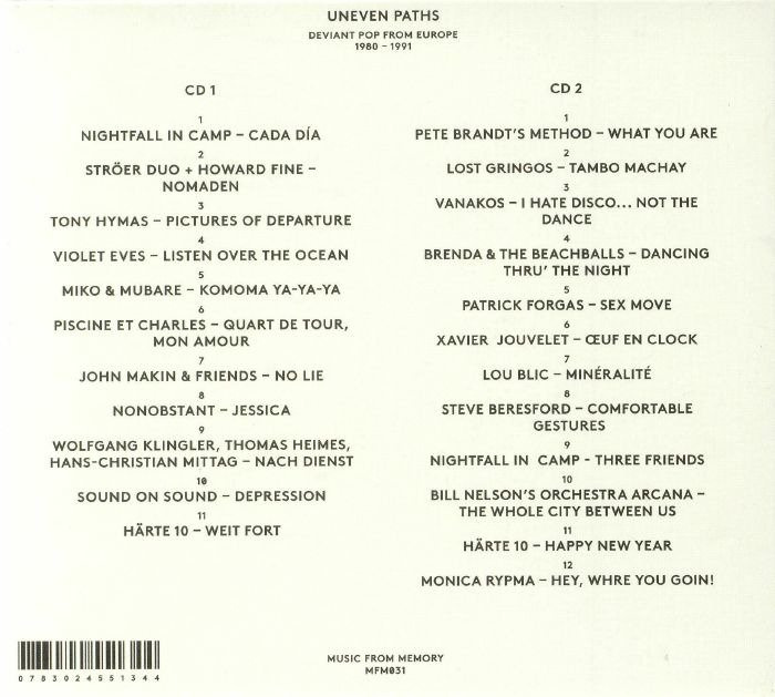 First released on vinyl earlier in the year and now available on CD for the first time, "Uneven Paths" sees the admirable diggers behind the Music From Memory label mine the eccentric, often inspired but rarely visited fringes of Europe's 1980s electronic pop scene. The duo behind the set, Jamie Tiller and Raphael Top-Secret, describe the collected material as "deviant pop" - melodious, left-of-centre obscurities that some may consider "Balearic". It's pop music from the outer limits, with the duo offering up tracks that variously draw influence from spoken word, global rhythms, post-punk fusion, new age ambient and kosmiche. Their selections are spot on throughout with genuine surprises around every corner.