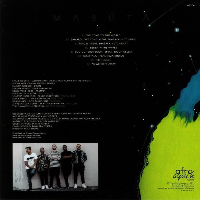 Afrosynth Records' latest must-have release comes from Mabuta, a Capetown-based collective headed up by jazz bassist and occasional electronic experimentalist Shane Cooper. "Welcome To This World" is naturally rooted in jazz, though it's spiritual movements and cosmic vibrations regularly include suitably intergalactic synth sounds and nods towards jazz-funk and Afro-beat. The latter influence comes to the fore on Buddy Wells collaboration "Log Out Shut Down", while the brilliantly out-there "Tafattala" wraps bustling, crashing jazz drums in mind-altering backwards instrumentation and Cooper's booming double bass. Mabuta is of course capable of providing good, old-fashioned laidback jazz moments, as the Cinematic Orchestra-esque "As We Drift Away" emphatically proves.