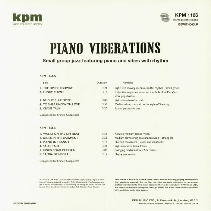 Piano Viberations’ “small group jazz featuring piano and vibes with rhythm” makes for a gorgeous Francis Coppieters showcase, surely one of Belgium’s best-kept musical secrets. Released in 1975, and arguably the most low-key of the KPM and Themes records we’re re-issuing, this is easily our current favourite. “The Open Highway” is the appropriately-named opener, and immediately demonstrates Coppieters’ dexterous interplay between piano and vibes in assured, joyous fashion. The shuffling bossa of “Sales Notes” is a jaw-dropper, well-mined by samplers with impeccable taste. The mellow head-nod drum-break that is “Funky Chimes” brilliantly demonstrates Coppieters’ quiet majestic side with its slow-motion funk rhythm with beautifully reflective notes throughout. The upbeat and joyful “Cross Talk” closes out side A. Vibes and piano are definitely at the heart of the arrangement here. The quick cut movement of “Piano In Transit” is another gem, driven principally by piano but those vibes along for more than just the ride. On a more gentle, elegiac note, “To Shearing With Love” is a warm, slow, romantic piece in the style of George Shearing. It’s plaintive and sublime. Piano Viberations is one of those rare library records the original description of which makes as much sense now as it did when it was first released. Piano and vibes with rhythm indeed. As with all ten re-issues, the audio for Piano Viberations comes from the original analogue tapes and has been remastered for vinyl by Be With regular Simon Francis. We’ve taken the same care with the sleeves, handing the reproduction duties over to Richard Robinson, the current custodian of KPM’s brand identity.