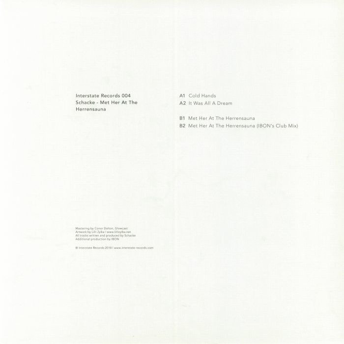 For its fourth instalment, Interstate welcomes Copenhagen's Schacke. Rooted in punk and noise, the Danish artist grew into becoming one of the key figures of Copenhagen's scene and inner part of Courtesy's Ecotherm and newly found Kulor imprint. On INS004, Schacke delivers three originals, exploring musical spheres that are both brutal and graceful. The opener "Cold Hands" kicks things off on a dark yet atmospheric note with driving percussions that make your body shake. "It Was All A Dream" is built around an irresistible synth loop that is accompanied by angelic noises and winds. While this track blooms in its flow and drive, the short break shows what an exceptionally gifted producer Schacke is.The flip-side features the title track "Met Her At The Herrensauna" which is the record's most euphoric. Dazzling leads, shimmering synths and a somewhat otherworldy yowling loop drive this track which has all potential to create the special dancefloor moment one won't forget. At last, IBON, another Copenhagen talent, delivers his take on "Met Her At The Herrensauna" by giving the original an even more clubby and trancy touch. The two combined make this 130bpm and upwards Copenhagen take-over complete!