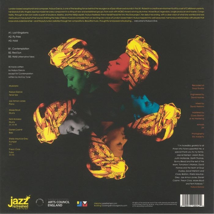 Second time around for Nubya Garcia's sought-after set "Nubya's 5ive", a killer crossover jazz set that's been changing hands for serious sums of money since it first appeared on vinyl in May 2017. This timely repress is identical in almost every way to the original release, meaning you now don't have to break the bank to cop a copy. Highlights are plentiful throughout, from the dancing saxophone refrains, skittish jazz drumming and meandering Rhodes lines of "Lost Kingdoms", to the sunshine, piano-fired brilliance of bona fide summer anthem "Red Sun", via the slow-build epic that is "Contemplation". Happily, you get two takes on floor-filler "Hold", too.