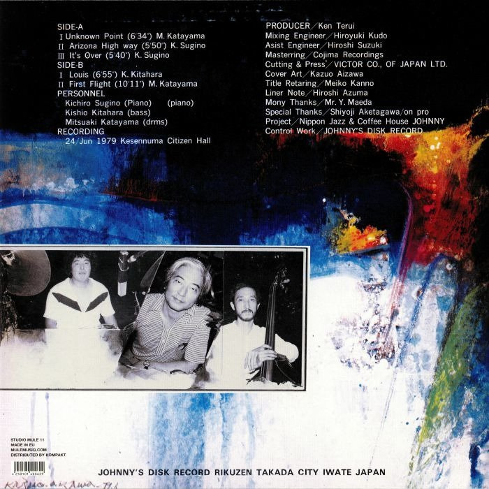 Johnny’s disk record is an independent jazz label run by the owner of jazz cafe kaiunbashi no johnny located in rikuzentakata city in iwate prefecture, japan. the legendary label released a string of albums of high quality but down-to-earth music, spanning from modern jazz, avant-garde jazz to left-field pop. albums such as “farewell my johnny / left alone” and “aya’s samba” has reached cult status among fans as some of the best works to come out of the japanese jazz scene. this debut album by drummer and actor mitsuaki katayama is a japanese jazz masterpiece, put out by johnny’s disk record—an independent jazz label run by the owner of jazz cafe kaiunbashi no johnny located in rikuzentakata city. consisting of 5 original compositions, the no-filler album includes the tracks “unknown point,” a danceable jazz samba with tight and powerful drumming; the melancholic “arizona high way,” a tune that perfectly epitomizes what japanese jazz is about; “it’s over,” which features beautiful piano work by kichiro sugino—a promising pianist who tragically succumbed to a chronic illness and couldn’t fully realize his potential; “louis” and “first flight,” a jazzy dance cut with a funky bassline.