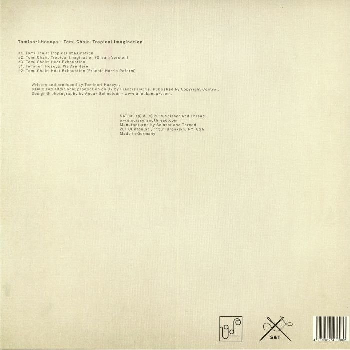 The latest transmission from Francis Harris' exquisite Scissor And Thread imprint showcases the many talents of Tokyo's Tomi Chair aka Tominori Hosoya. The DJ and producer goes by both names, and here presents five tracks of lush, emotional music veering between ambient excursions and dance floor heaters. The original version of title track 'Tropical Imagination' opens the EP, and is a deep and thoughtful dance floor number. Elegant chords set the tone while the percussion adds a silky funkiness that's impossible to ignore. The 'Dream Version' strips the track down to its pads and atmospheres. Next up is Tomi Chair's 'Heat Exhaustion' - an exceptionally beautiful beatless piece that drifts through droney pads and occasional fragments of minor key melody. Using the Tominori Hosoya moniker, side B begins with 'We Are Here' - another powerfully restrained piece that merges woody percussion with low key pads and field recordings to create a magical whole. Francis Harris adds his touch to 'Heat Exhaustion' with his respectful Reform version, adding skittering percussion and underpinning the piece with a leftfield ambient house edge that builds and builds. Another essential addition to the Scissor And Thread catalog.