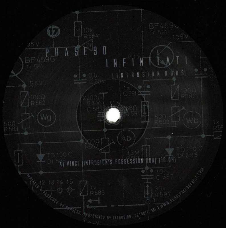 It's been five years since Echospace man Stephen Hitchell donned the Phase90 alias for "Infinitati", a suitably dark and dubbed-out debut album that remains one of his most mesmerizing releases. All these years on, he's decided to rework three of the album's most potent tracks under one of his other aliases, Intrusion. The heart of the EP is undoubtedly his A-side "Possession Dub" of "Vinci", a quiet, contemplative and effortless spacey dub techno revision that bubbles away for almost 16 minutes. He switches focus on the B-side opening "Remake" of "Infinitati", re-imagining the track as a cloudy and slowly pulsing ambient soundscape, before offering up a "Metamorphose" revision of "Ango" that's as deep and ambient as dub techno gets.
