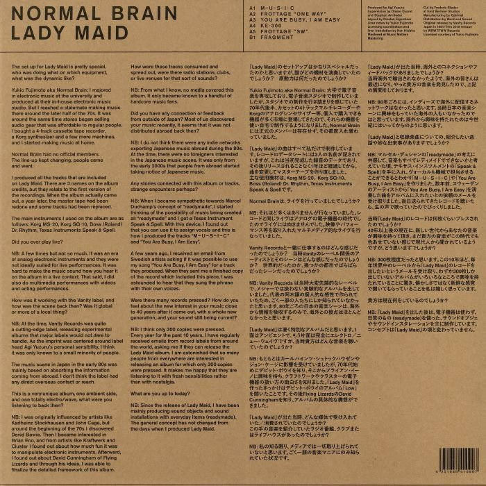 Originally released in 1981 as a limited vinyl pressing of 300 copies on Agi Yuzurus fabled experimental label Vanity Records (R.N.A. Organism, Dada, Sympathy Nervous, Tolerance), Lady Maid is a testament to the creativity of the early 80s Japanese electronic and experimental scene, encapsulating a prolific era when audio gear became affordable for musicians to explore sounds in the comfort of their home, free from studio time pressure and major label rules.