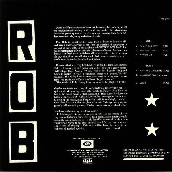 Eight years on from its previous reissue (that time courtesy of Analog Africa's "Limited Dance Edition" series), Mr Bongo is offering up a fresh, licensed re-press of Rob's eponymous 1977 Afro-funk masterpiece. If you missed out in 2011, the set is definitely worth picking up because it's rock solid heat from start to finish. Check, for example, the heavily percussive Afro-beat/Afro-funk fusion of "Funky Rob Way", the flanged funk guitars and heavy brass action of "Boogie On", the jazz guitars and loved-up vocals of "Your Kiss Stole Me Away" and the William Onyeabor-does-James-Brown heaviness of closing cut "More".