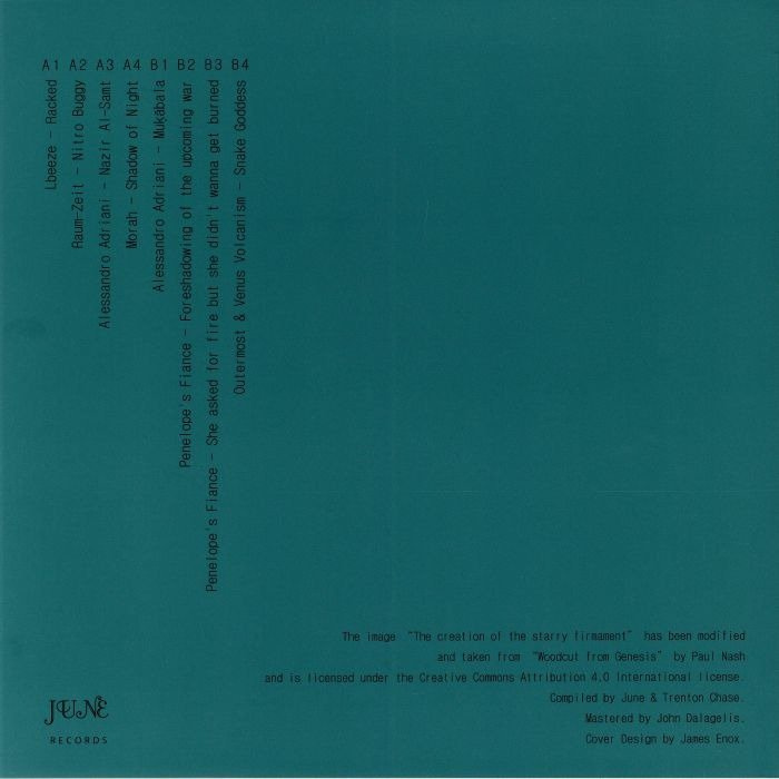 June Record's latest compilation welcomes new artists on the label, the Australian newcomer Lbeeze, Raum-Zeit (Toni Quiroga & Eindkrak), Mannequin Records' boss Alessandro Adriani, Morah (Phormix), Penelope's Fiance and Outermost & Venus Volcanism.