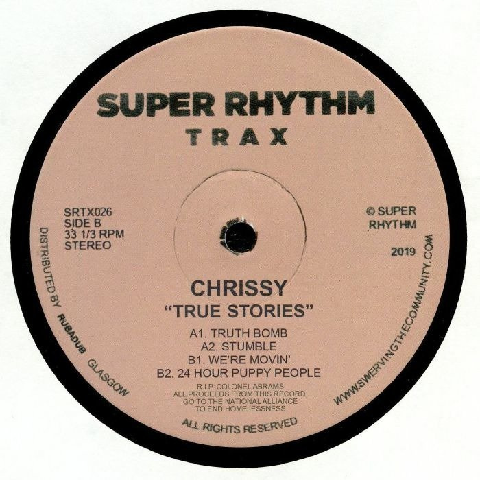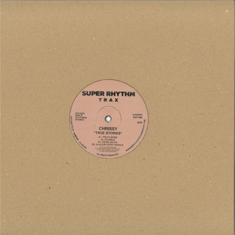 For his debut on Super Rhythm Trax his wings remain characteristically unclipped as the tone veers from the massive Acid wall of 'Truth Bomb' (built upon an acappella from a house legend) through the ghostly dubbed out 'Stumble' to the anthemic house of 'We're Movin' before finally resting on the 21st century New Beat of '24 Hour Puppy People' .