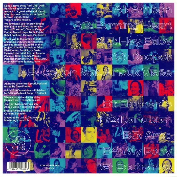 We first came in touch with Daso when we saw him performing live at the Dachkantine in Zurich around 2006. He really had this stage talent which fascinated us straight from the beginning. At this party we agreed on the first release on Connaisseur, the "Adventure EP" including the strong "Sam n Max", which was a great presentiment of the many releases to come. Daso was a unique character with a lovely sense of humour, and surprising quirks which could be like marvels to us. One moment, we would be worried just seeing him crossing a busy street and in the next, he would be rocking the stage with major self-confdence and the attitude of a real rock star. In our history of Connaisseur, he defnitely was one of our most important artists, and some of his best music was released with us. He played many label nights, and together we enjoyed uncountable laughs, discovered cities and countries while touring and collected invaluable memories. It is the way of the world that we as a label eventually focussed on new artists, and Daso, too, embarked in new directions. We still stayed in touch, even though the gaps between our contacts became bigger with time. The frst time we realized that Daso was ill was in the frst quarter of 2016. We had invited him to our 10th anniversary party in Berlin, but he didn't feel well enough to be able to come. Shortly after this, he went to the doctor and was diagnosed with cancer. We were shocked. Daso was always such a positive person, it simply didn't add up for us that someone like him could get sick. Obviously an irrational and unjust thought, but it just felt so unfair. When he started chemo therapy I spoke to him on the phone, and my label partner Martin, who lives in Berlin, gave him a frst hospital visit early in summer of that year. A bit later we visited him together, and yes, he was optimistic, still full of humour and also motivated to pick up his career again as soon as possible. This impression was of course only from a distance, but I was delighted to see how confdently he presented himself on socials after all his treatments, and how after recovery he started playing gigs again. At some point I realized Daso hadn't been active on his socials for a while, which concerned me. This was in the frst quarter of 2018. His last post on Facebook had been made on November 30th and I knew this couldn't bode well. After contacting some common friends I was told his prospects were not good. I was about to go on an Easter holiday but planned to visit him on my next monthly trip to Berlin. I didn't have the chance. On Easter Monday, April the 2nd, 2018 Daso passed away. At Daso's funeral, which was on a wonderfully sunny day in late spring, his father came up to me and asked if I might be interested in releasing this album, which Daso had been able to fnalise in the last months and weeks of his life. We didn't decide on doing so lightly, knowing that the release of a post-mortem album can bring up certain issues. However, in the end, we agreed to do it, as we sincerely strive to create a fnal memento for Daso's musical legacy. The self-titled album Daso will be released on April 5th, three days after the first anniversary of Daso's obit.