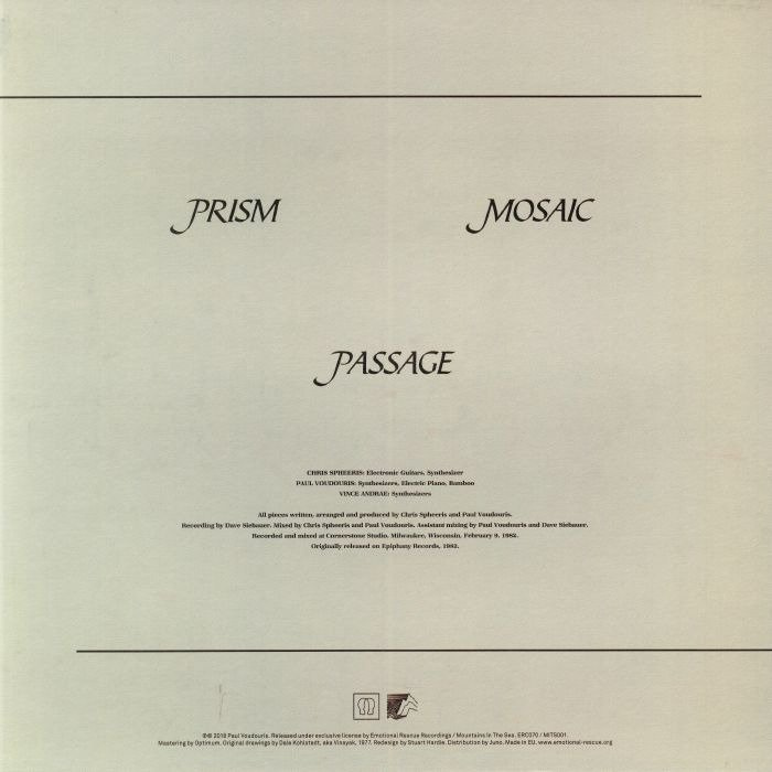 Few records could sound better suited to Emotional Rescue's reissue remit than soft rock / synth pop artists turned sound healers Chris Spheeris and Paul Voudouris. "Passage" was a commission by a company doing biofeedback therapy who wanted a soundtrack for their clients' treatment, resulting in a gem of early American ambient music. Originally released in 1982 and now lovingly restored, artwork and all, Spheeris and Voudouris' three lengthy compositions are as soothing as the remit demanded. Whatever your internal ails, there's restorative qualities in these pieces that can't help but do good, even as a pure pleasure trip to let yourself melt into.