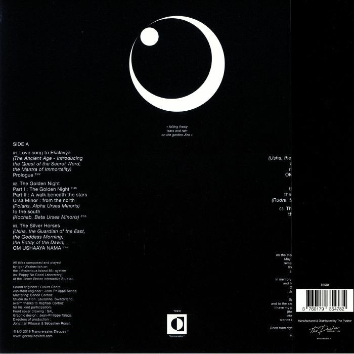 Transversales Disques presents KSHATRYA, (The Eye Of The Bird), never released before recording by french avant-garde electronic composer Igor Wakhevitch, who composed a bunch of major experimental albums in the 70's such as Logos, Docteur Faust, Hathor, Les Fous d'Or, Nagual and Let's Start. During this 10 years period, Wakhevitch was close to Jean-Michel Jarre, the Pink Floyd, the Soft Machine, and legendary choreographer Maurice Bejart having with him many conversations around dance and music, human body and soul, spiritual path, collective life, new society, human evolution. As a composer Igor Wakhevitch collaborated with Salvador Dali, Carolyn Carlson, and Terry Riley to name a few. He's considered as one of the first French composer using synthesizers like Synthi AKS, ARP2600 or Moog modular systems. After spending almost 30 years in India, Igor Wakhevitch dug in his archives this unreleased work recorded in 1999 on his 'Mysterious Island 88' system. Esotheric, sacred and cosmic, KSHATRYA, (The Eye Of The Bird) is the logical follow up of Igor's early works and a monumental piece of electronic music. A must!