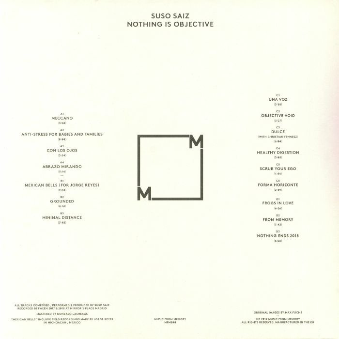 Nothing Is Objective was recorded in Madrid in 2018 during a period of transcendental change and creative awakening for Suso. It captures the composer as he develops a renewed relationship with his instruments and craft, channeling a dialogue between the meticulous use of technology and the outer reaches of human expression. Suso's universe is one that remains in constant mutation and emphasizes time above all else. His radiant drones are a nest of hidden feelings; they glisten with complex emotions and textures, teasing out moods of vulnerability and hope. Nothing Is Objective is a delicate and intimate record that harnesses smalls drops of sentiment for listeners to withdraw into. Released in a gatefold 2xLP it features collaborations with Austrian guitarist Christian Fennesz, liner notes by John Gómez, and music dedicated to Suso's friend, the late Mexican musician Jorge Reyes. Nothing Is Objective cements Suso's place as one of the label's central and most loved artists.