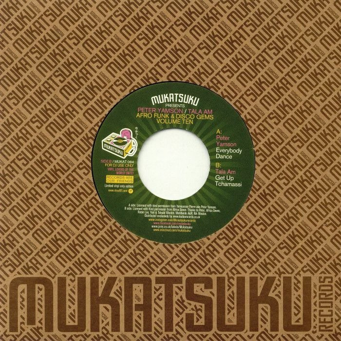Volume Ten of the Mukatsuku label's Afro Funk & Disco Gems series has two more tracks released for the first time on a 7 inch in their own right. First up is Peter Yamson's 80's afro boogie feelgood masterpiece ''Everybody Dance'' taken from the Sun On Africa album (mispelt on discogs as Sun Of Africa by the way ! ) and licenced directly from the artist .Infectious chorus and funk groove with Roy Ayeresque vibes and punchy brass . On the flipside from 1981 we get Get Up Tchamassi from french african group Tala AM which is a funk drenched heavy slap bass boogie mostly instrumental affair with female vocals and great sax playing and catchy rhythm guitar.