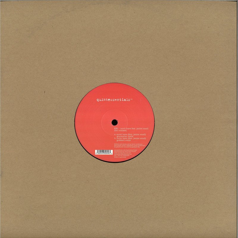 Following on from the positive feedback for KRL's 'Third' EP (Quintessentials 62), we had to give the standout track 'Never Leave' the remix treatment. 'Never Leave' is a straight up house track with those beats and rhythmic synths, but with the outstanding vocals of Janine Small it makes it a head turner! The A-side remix, courtesy of Greymatter (Wolf Music, Unique Uncut) keeps the overall vibe of the original, but adds more dirt and bass business ready for club action. The B-side remix courtesy of Quintessentials buddy Loz Goddard (Church, Razor-n-Tape) takes a step into deep broken beat territory while keeping the beautiful vocals. We love both remixes, job's done!
