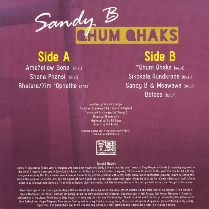 Qhum Qhaks comes from a close collaboration between Sandy and Danish DJ and collector Simon Lundsgaard a.k.a Simone Ahà. All songs were recorded in Sandy's home studio to stick close to the ethics and production techniques of the 1995 classic. The material that emerged from this experimental process between the two of them captures the spirit of old school kwaito from the 90's.