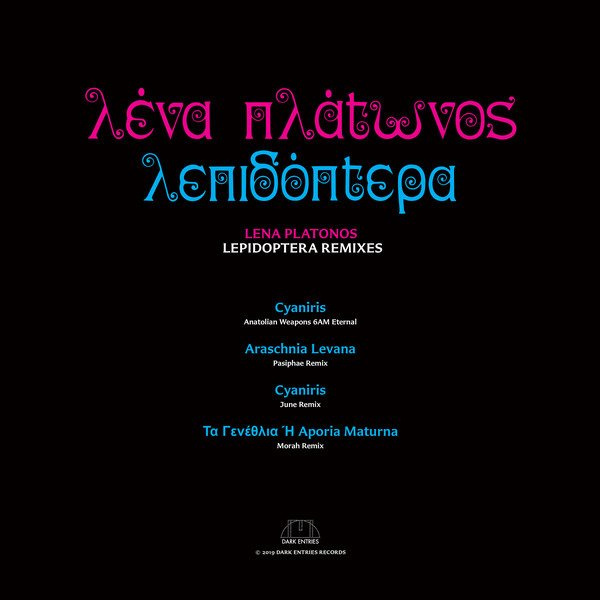 Last year, Dark Entries reissued Lena Platonos' 1986 album "Lepidoptera", a beautiful, minimalistic set forged out of picturesque piano motifs and the composer's own surrealist Greek poetry. Now the lauded San Francisco label presents a quartet of new reworks of tracks from that album. There's a more dancefloor-centric feel throughout, with the standout revisions - in our eyes at least - coming from Anatolian Weapons, whose take on "Cyaniris" is a throbbing, dark synth-pop treat, and Pasiphae. Her version of "Araschnia Levana" brilliantly re-casts the track as a heavy, all-action dark electro workout tailor made for dark basements in The Hague.
