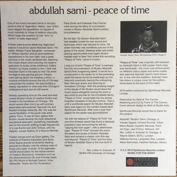A Spiritual Jazz, Ultra-rare Holy Grail From Abdullah Mudon Sami And New Yorks & Chicagos Late 70s Underground Jazz Scene, That Has Acquired Mythical Status. Originally Self-released In 1978 By The Artst In Just 300 Copies, Its Now Been Remastered And Reissued For The Frst Tme On Vinyl. A High Antcipated Reissue Amongst Collectors, Peace Of Time And The Story Of Mudon Abdullah Sami Is The True Stu Of Legend.