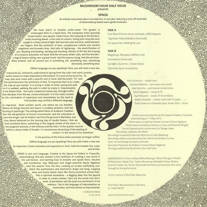 In this sense, SPAZA, the album, is a conceptual coalescence of space, the body politic and an approach to music making. Helmed by the arbiters of spontaneity, Mushroom Hour Half Hour, this loping, expansive recording brings together musicians already adept at creating on the fly and playing in unlikely set-ups with their instruments of choice.