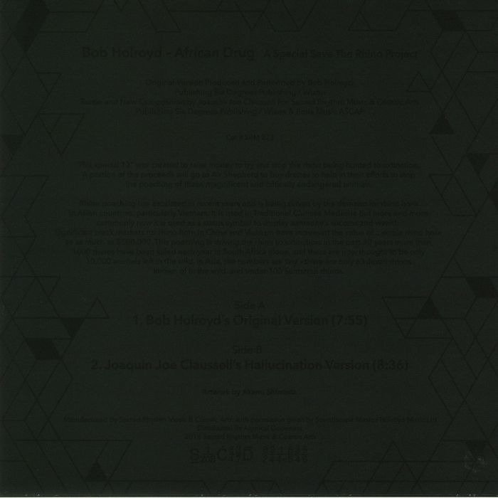 Long before the rise in interest in African music, British electronica producer Bob Holyroyd was making tracks rich in traditional instrumentation. "African Drug" is, undoubtedly, the most famous of these. Originally released as a single in 1994, the intensely melodious, Steve Reich-esque work has been remixed numerous times over the years. This latest edition arrives on Joaquin "Joe" Clausell's Sacred Rhythm label, with profits going to charities that work to save Africa's endangered Rhino. The A-side contains a freshly mixed and re-mastered version of Holroyd's brilliant original - which brilliantly increases in intensity with the addition of tribal drums two thirds of the way through - with a more percussive, pleasingly hallucinogenic Clausell remix on the flip. In a word: essential.
