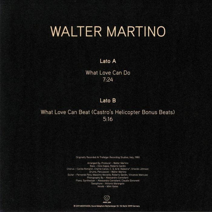 Reissue from 1980, Italy. Soundtrack theme from Walter Martino (of Goblin and Libra) for low budget French produced movie filmed in Italy “Nervi A Pezzi”. Extremely dreamy emotional journey titled “What Love Can Do” featuring Walter Martino’s percussive virtuosity and excellence as composer/arranger/producer. B side features a beefed up stripped down “bonus beats” by Castro-Moore with additional percussive elements.