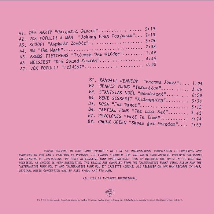 REPRESS ALERT: The Alternative Funk series was a hidden weapon for obsessive collectors of 80s obscurities across the spectrum of new wave, minimal wave and other such cult movements in this most creative of eras. With Platform 23 having just dropped the first volume of reissued material from this deep cover collection, they're right back on the case with another 15 oddball gems for your delectation. Dee Nasty's "Orientic Groove" is as exotic and funky as it sounds, while 3M create a kind of nightmarish collage of noise, found sound, percussive lurch and a positively unhinged brass section. That gives you just some idea of the scope you can expect to enjoy on this welcome reissue.
