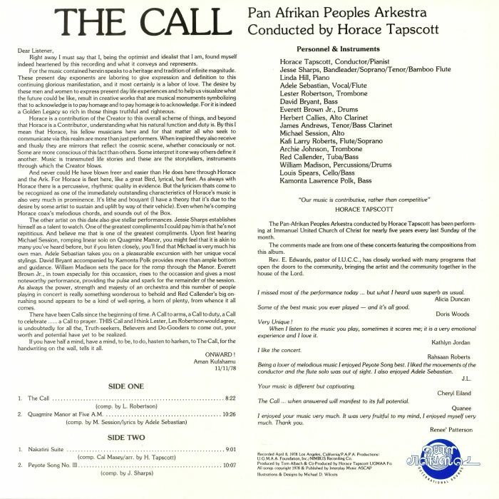 The Call was put together from two studio sessions in April 1978, one at Hollywood Sage and Sound, one at United Western - the latter session had the addition of a string section, who can be heard on the moody Cal Massey composition 'Nakatini Suite' and Jesse Sharps' swinging modal trip, 'Peyote Song No. III', with its swirling soprano solo. In keeping with the communal nature of the Arkestra, the other two compositions, 'The Call' and 'Quagmire Manor at Five A.M.' are also by Arkestra members. But at the centre of the music is the builder of the Ark, the visionary whose original call to action started a movement whose legacy continues to this day - Horace Tapscott.