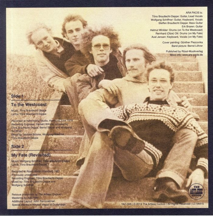 As the "To the Westcoast" LP was released during a time when styles like New Wave, Synth Pop and Punk became popular in Germany and the interest in organic and soulful rock declined, Ara Pacis’ debut remained relatively unnoticed until today and even the Krautrock collector’s scene does not seem to be fully aware of this hard to find gem yet of which only 1000 copies were originally pressed. The band is still kept in good memory by their fans as a quite legendary live act and although they