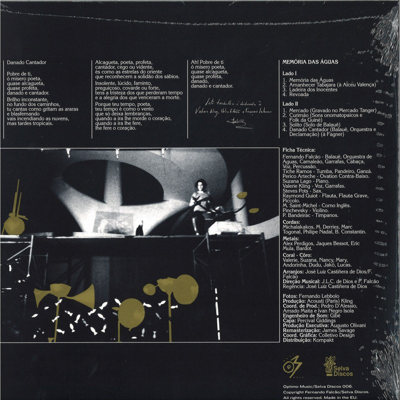 Remastered from the original master tapes, not only the sound but the artwork of Memória das Águas was completely and faithfully restored. Also, the reissue comes with unprecedented liner notes featuring rare photos of the musician and his sound sculptures plus articles that help to explain who Fernando Falcão was and where Memória das Águas sits among other staples of Brazilian music, including one from DJ and selector John Gómez – who helped to connect Selva Discos' Augusto Olivani with Diana Lion, Fernando Falcão's daughter (since the musician died in 2002), for this project. After Memória das Águas, Selva Discos will also reissue another long lost Fernando Falcão LP album – Barracas Barrocas.