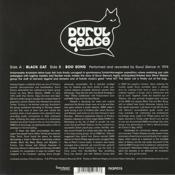 Unintended for commercial release, curiouser and curiouser, Finders Keepers proudly present these previously unheard tracks sourced directly from original tapes, which stand as a testament to the inimitable talent of Gence and the only studio document of the mythical AMM Turk jazz funk troubadours, representing a pop-psych Hollandaise holiday postcard which has taken five decades to be delivered. 45 revolutions later... The cat’s got the cream.