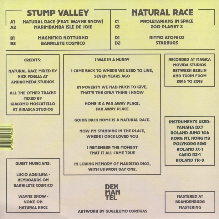 The label say "Stylistic, enigmatic, and effortless. Stump Valley’s Dekmantel debut EP is a smooth melange of glossy soul, jazz, and serene house. Produced by the mysterious, and ultimately under-the-radar duo, the extended EP breezes through tropes of balearic analogue, warm Chicago sounds, yet remaining ultimately Italian. The duo, originally from Turin, prove their skills as true alchemists, as their forge hypnotic house and tropical flare through their array of drum machines, synths, and informed artistry derived from their deep stockpile of assorted records.