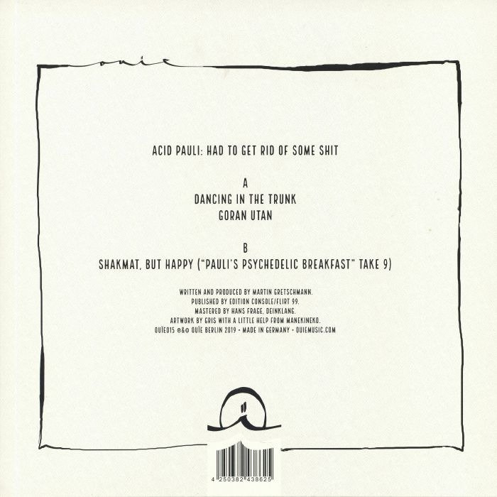 Acid Pauli is back with another three-track EP on the label he co-manages with friend and collaborator Nico Stojan. This EP, self-effacingly titled 'Had to get rid of some Shit', showcases Martin Gretschmann’s dancefloor prowess yet again. 'Dancing In The Trunk' is a hyped-up loopy banger - minimal in instrumentation but fully psychedelic in execution. 'Goran Utan' has a deeper, darker edge, with a tension that will tighten the grip on many dancefloors. 'Shakmat, but happy' appears in 'Pauli's Psychedelic Breakfast Take 9' and is a slow-building, loop-based groover, eventually opening up to reveal tinges of acid.