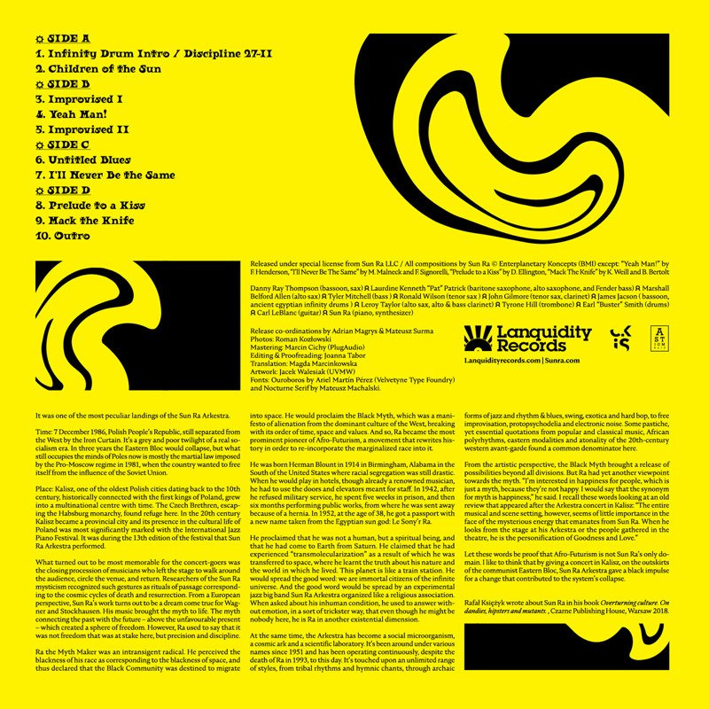"Long thought lost and now refound and restored thanks to Lanquidity Records, legendary live recording of the Arkestra's first visit to Poland at a time of growing unrest against Soviet occupation. There couldn't be a greater call for freedom, especially of the mind and soul, than Sun Ra's music. Herein, Arkestra classics such as "Children of the Sun" can be found next to mindbending improvisation, such as on "Infinity Drum Intro". Like the best of Ra's releases, essential."