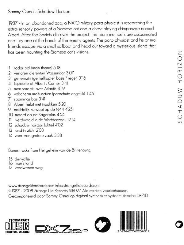 S.Osmo's score for the cult 1987 dutch Schaduw Horizon movie. 1987 - In an abandoned zoo, a NATO military para-physicist is researching the extra-sensory powers of a Siamese cat and a chess-playing chimpanzee named Albert. After the Soviets discover the project, the team members are assassinated one by one at the hands of the enemy agents. The para-physicist and his animal friends escape via a small sailboat and head out toward a mysterious island that has been haunting the Siamese cat's visions.