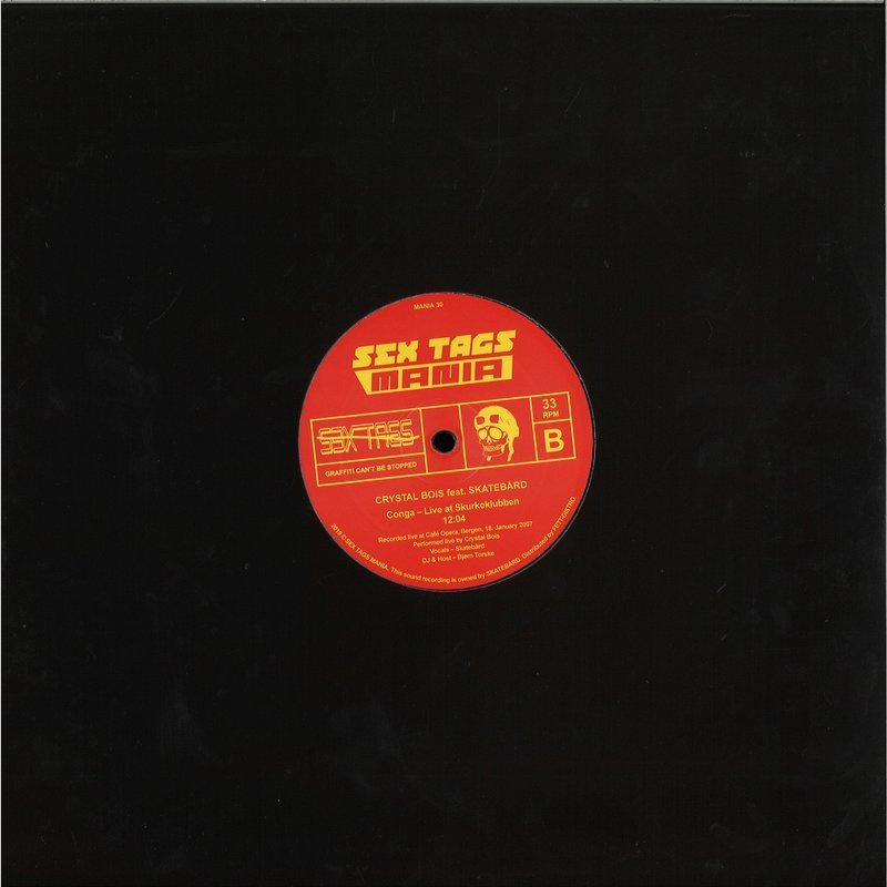 Skatebård's "Conga" has turned to be one of the most sought after releases from the Sex Tags Mania catalog with it's sparse pressing of about 2-300 copies – though most of the original stock was given away as the record gained minimal interest in 2005. The original record was cut with excellence by Lawrie Immersion – and pressed in his own plant – the now defunct Curved Pressings. MANIA 30 – the repress of "Conga" has as close to original sound as possible and it also carries a new B-side – the Crystal Bois live version of "Conga" from 2007, featuring Skatebård on male vox!
