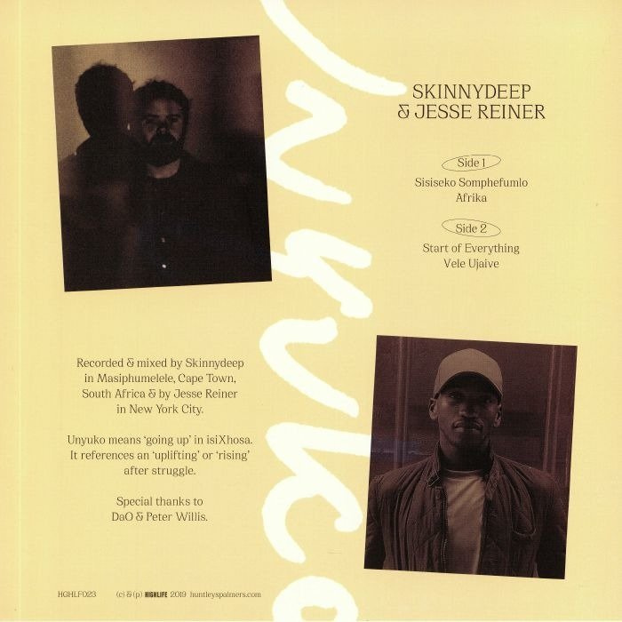 Brought to you in collaboration between Skinnydeep from Masiphumelele - one of the largest townships in Cape Town - and Jesse Reiner of Brooklyn, NYC. The two producers bonded over a shared sensibility in electronic minimalism, Zulu rhythms, house and techno and began a year’s long international collaboration resulting in Unyuko - meaning 'going up' in isiXhosa, one of the Bantu languages of South Africa. It references ‘upllifting’ or ‘a rising’ after struggle and couldn't be a more appropriate title.