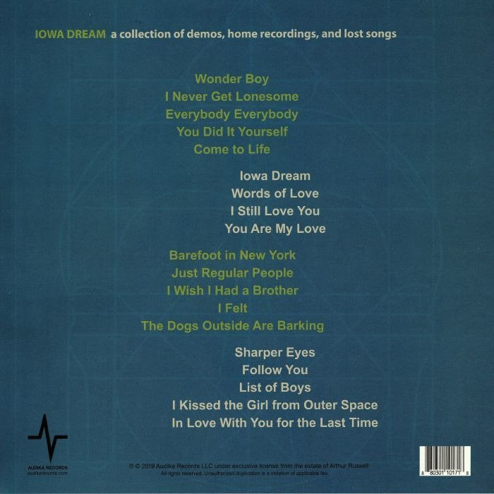 Now, after ten years of work inside the Russell library, Lee and Knutson bring us Iowa Dream, yet another bright star in Russell’s dazzling constellation. Blazing with trademark feeling, these nineteen songs are a staggering collection of Russell’s utterly distinct songwriting. And although Russell could be inscrutably single-minded, he was never totally solitary. Collaborating here is a stacked roster of downtown New York musicians, including Ernie Brooks, Rhys Chatham, Henry Flynt, Jon Gibson, Peter Gordon, Steven Hall, Jackson Mac Low, Larry Saltzman, and David Van Tieghem. Musician Peter Broderick makes a contemporary addition to this list: more than forty years after Russell recorded several nearly finished songs, Broderick worked diligently with Audika to complete them, and performed audio restoration and additional mixing.