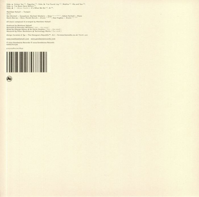 "I am very proud of these early recordings. They represent the starting point of my musical journey in Manchester and showcase some of the cities finest musicians such as: Nat Birchall, Chip Wickham, Rachael Gladwin, Adam Fairhall, Gavin Barras and Gaz Hughes. They are also the very first recordings my brother and I decided to release on our record label (Gondwana Records). Listening back they sound full of energy and joy and really reflect how I was feeling at that precise moment. But as much as I loved the music, I was never 100 percent happy with the sound of the mixes and mastering. So I decided to go back to the original tapes to remix and remaster them and present them the way I'd always wanted, and along the way we unearthed a couple extra unreleased tracks, which we decided to include as bonus material. Myself and my brother also decided to bring in Ian Anderson of The Designers Republic to re-imagine the arwork and we are super blown away by the results!" Matthew Halsall, Oct 2019.