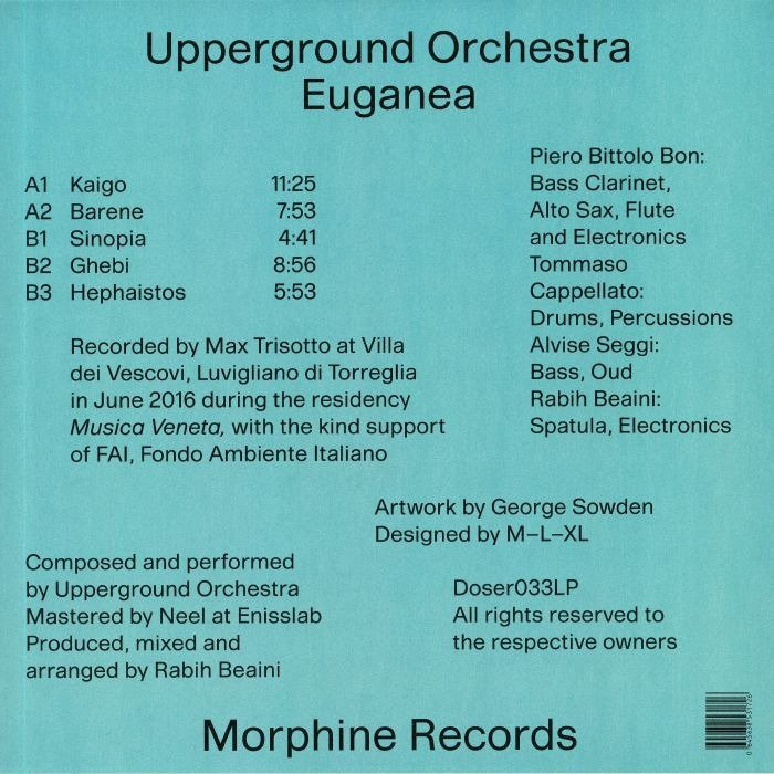 Upperground Orchestra is the hybrid Jazz band of Rabih Beaini and his fellow musicians Tommaso Cappellato (drums), Piero Bittolo Bon (woodwinds/electronics) and Alvise Seggi (Bass / Oud). The band is returns with a new LP, years after "The Eupen Tapes". Euganea is a 5 tracks LP recorded during the Musica Veneta residency, promoted by FAI (Fondo Ambiente Italiano) in the great context of Villa dei Vescovi. Working around Veneto music, the band developed pieces that merge deep roots of original fusion (tape music, electronics and synths, processing) with the free spiritual jazz sound of Upperground Orchestra.