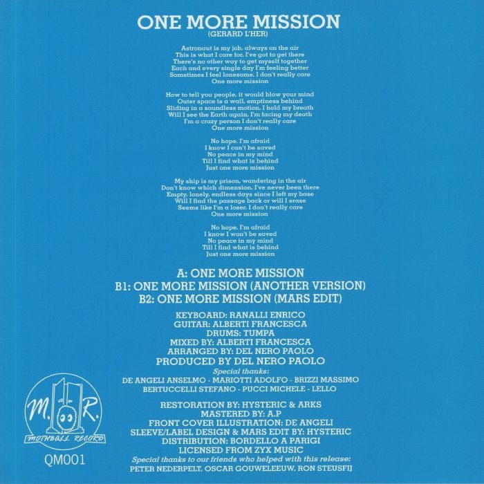 “One More Mission” is the Italo-disco answer to David Bowie’s “Space Oddity”, the tale of a lonely space explorer lost forever with no hope to return. Originally released in 1987 and fitting neatly into the Afro, Cosmic ... and Beppe Loda, thanks to it’s heavy downtempo beat, spaced out melody mixed with sound effects, classic rock and even oriental influences. ...