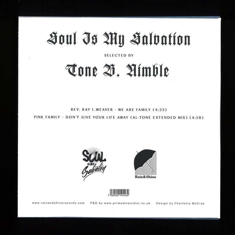 Rain & Shine's "Soul Is My Salvation" project is something of an epic: an eight-part series of "dancefloor friendly gospel songs" curated by veteran Chicagoan DJ Tone B Nimble (real name Anthony Fields). This first part - "Chapter 1" - opens with a sublime, gospel style sing-along cover of Sister Sledge classic "We Are Family" that sounds like it was actually recorded in church. It's brilliant, life-affirming stuff. Over on side B, scalpel fiend Al-Tone offers up an extended version of obscure New Zealand group The Pink Family's 1979 cut "Don't Give Your Life Away" - a warm-hearted - some would say righteous - disco workout that's almost as good as the A-side. We await the next volume in the series with baited breath.
